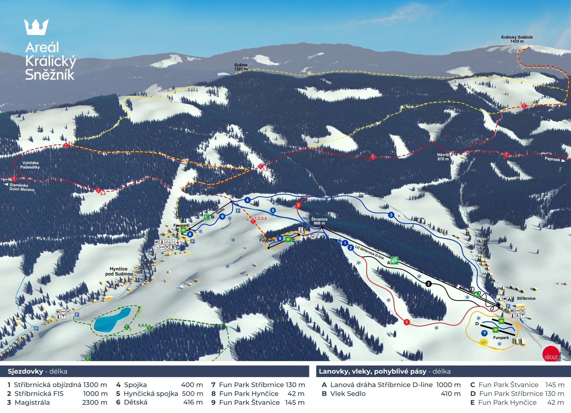 | Lanová dráha D-line (1000 m) | (1) 1300m, (2) 1000m, (3) 2300m, (5) 500m, (6) 416m, (7) 130m |